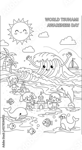Children building sandcastles on the beach with friendly ocean animals isolated on transparent background