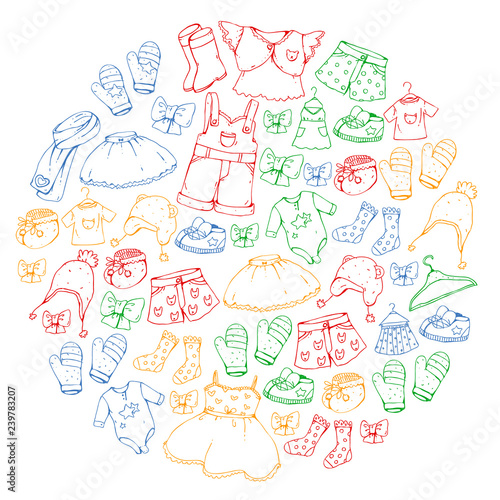 Children clothing and fashion. Dress, skirt, shorts. scarf, trousers for boys and girls. Kids fashion. Summer, winter, spring, autumn sale.