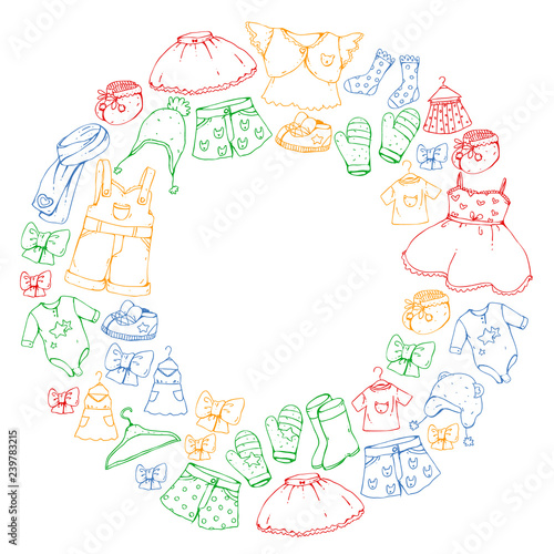 Children clothing and fashion. Dress, skirt, shorts. scarf, trousers for boys and girls. Kids fashion. Summer, winter, spring, autumn sale.