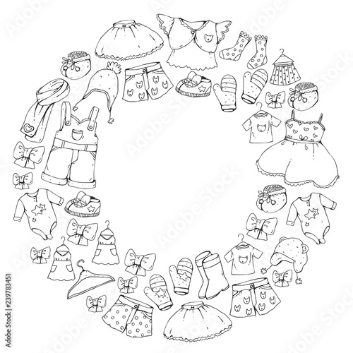 Children clothing and fashion. Dress, skirt, shorts. scarf, trousers for boys and girls. Kids fashion. Summer, winter, spring, autumn sale. Elements for coloring pages.
