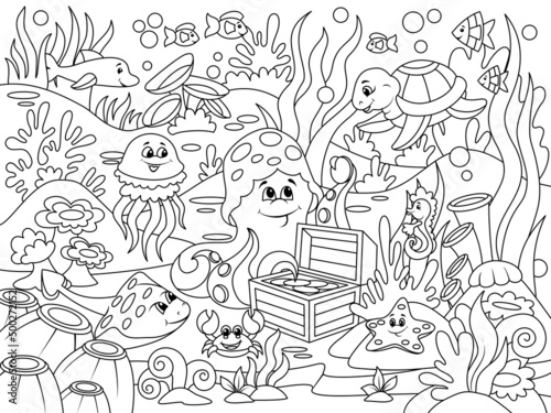 Children coloring, underwater world. Marine nature, animals and fish. Vector illustration, coloring book.