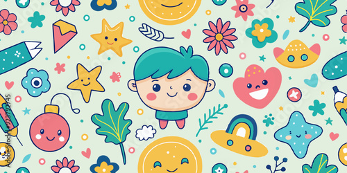 Children doodle seamless pattern, cute childish vector background print, kids funny naive texture. Cartoon hand drawn scribble shapes, flowers, stars freehand squiggle. Wax crayon children doodle