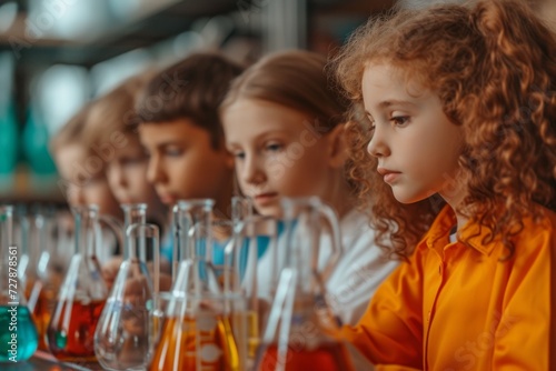 Children dressed in lab coats in a STEM education science laboratory doing experiments and observing colorful chemical reactions in beakers