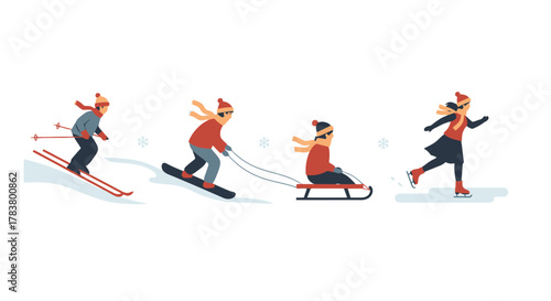 Children Enjoying Winter Sports Skiing Snowboarding Sledding and Ice Skating Illustration Set