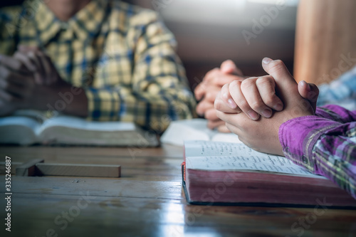 Children group praying with Bible on wooden table, Christian meeting concept. close up at to hand.