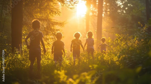 Children happily playing in nature, discovering plants and wildlife, surrounded by tall trees and sunlight filtering through
