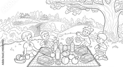 Children having countryside picnic under tree—vector illustration with food, nature scenery, and joyful activity for educational, seasonal, and lifestyle design use