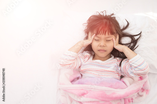 Children headache. Little girl lying in the bed