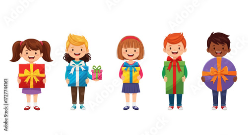 Children Holding Gifts Cartoon Illustration Diverse Group.
