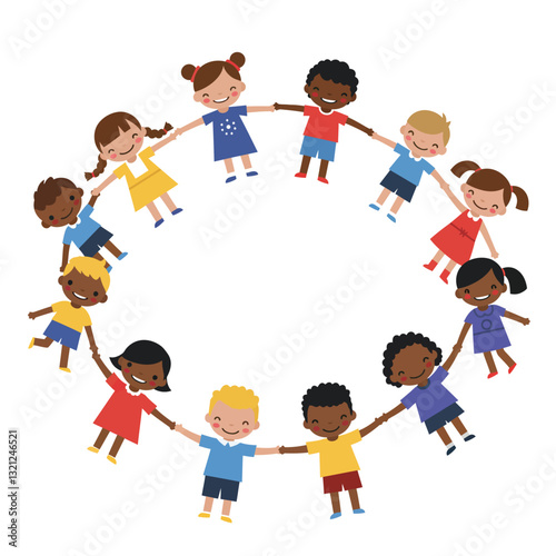 Children holding hands in a circle, flat design, cheerful colors, vector illustration