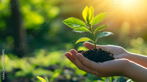 children holding young plant with sunlight on green nature background. concept eco earth day.