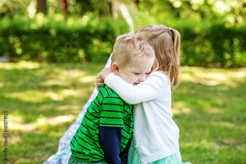 Children hug in the garden. 2-3 years. Girl and boy. The concept is childhood and family.