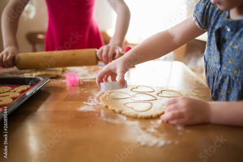 children in the kitchen make homemade cookies. kid cook at home. girl cuts hearts with a cutter