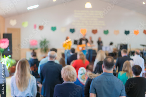 Children on stage perform in front of parents. Parents watch children's performances. Children's holiday