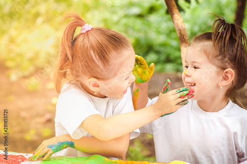 children paint with colored fingers in nature painting