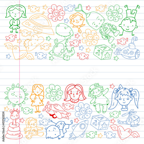Children play with toys in the kindergarten. Kids playground. Education, creativity, imagination.