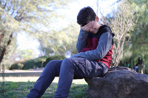 Children playing hide and seek in the park. Boy blindfolded and counting while playing hide and seek. Outdoor games. Classic children's game.