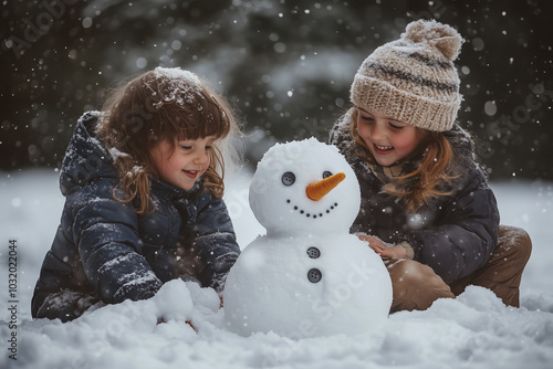 Children playing in the snow, building a snowman with a carrot nose and button eyes.