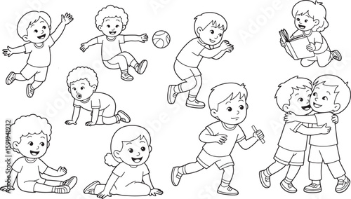 Children Playing Line Art Vector Set Featuring Kids in Various Activities for Educational Designs