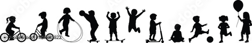 Children playing silhouette, kids outdoor activities, riding bicycle, jumping, skateboarding, running, playing ball, holding balloon, black vector illustration set