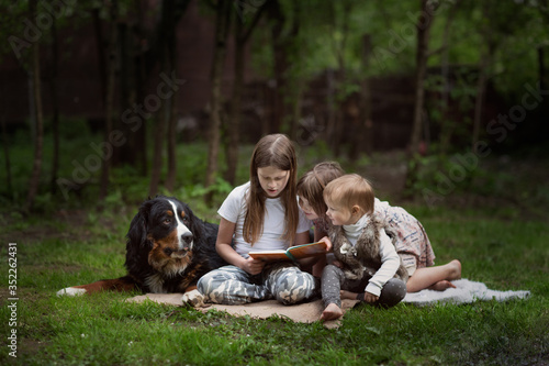 Children reading book together with big dog in summer glade, Three children with a Bernese Mountain Dog pet, friendship of a child and a dog, Dog therapy concept.