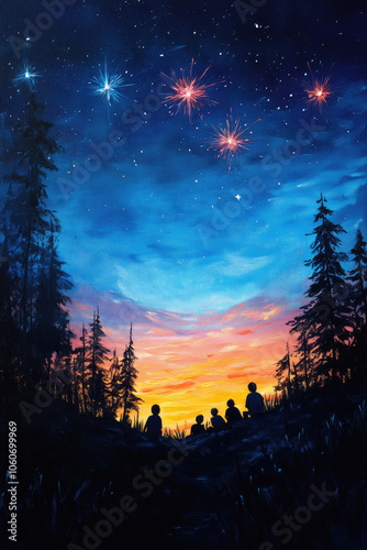 Children sit quietly, gazing at a vibrant sunset while sparkling stars illuminate the night sky in a tranquil forest setting