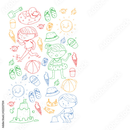Children summer vacation. Holidays with little kids. Sea, beach and ocean. Travel and adventure vector pattern.