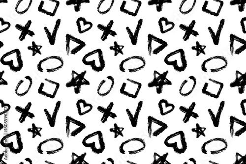 Children's abstract vector seamless pattern with hearts, crosses, stars and check marks.
