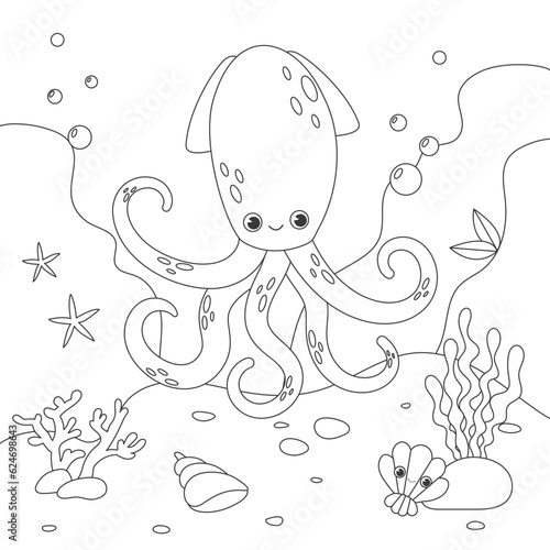 Childrens antistress coloring book with squid, seabed and algae. Vector stock illustration. Outline illustration of underwater life and marine animals. Underwater life of marine animals.