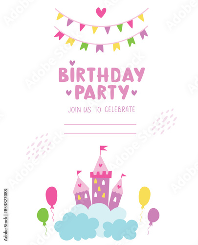 Childrens birthday invitation card for girl vector template design. Birthday party invitation card with cute decoration elements for kids event