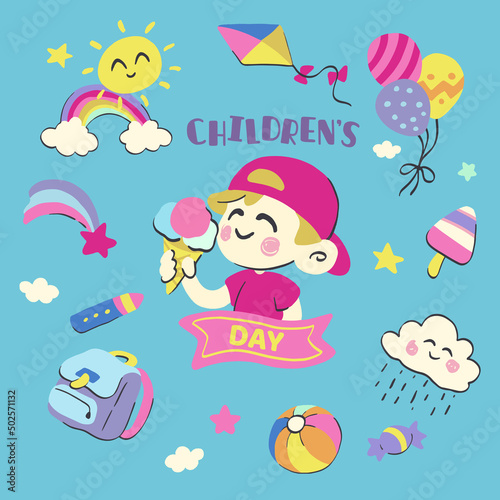 Children's Day greeting card with a boy who eats ice cream with a blue background with balloons with children's toys, cartoons background vector design