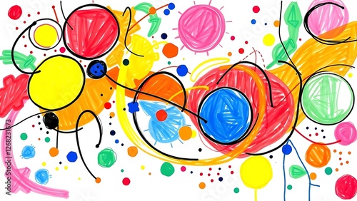 children's drawing abstract painting with colorful circles and dots on white background, composed of variety colors, including red, blue, yellow, green, orange, creating vibrant eyecatching design