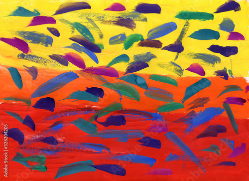 Children's drawing with watercolor paints. Cold strokes on a warm background