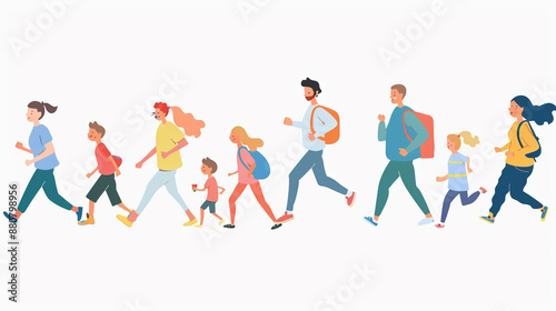 Children's drawings show a family and friends jogging. Cartoon style and white background.
