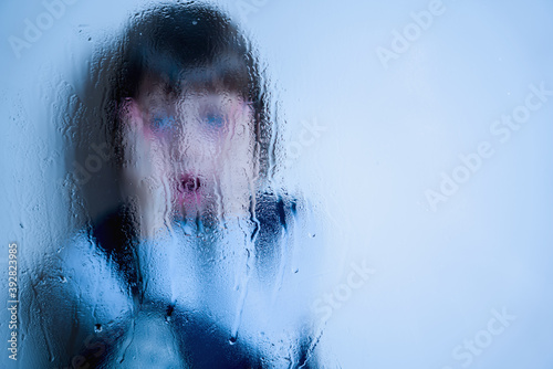 Children's fear and anxiety, psychological violence and pain. Young girl cries and screaming behind wet glass. Selective focus. Horizontal image.
