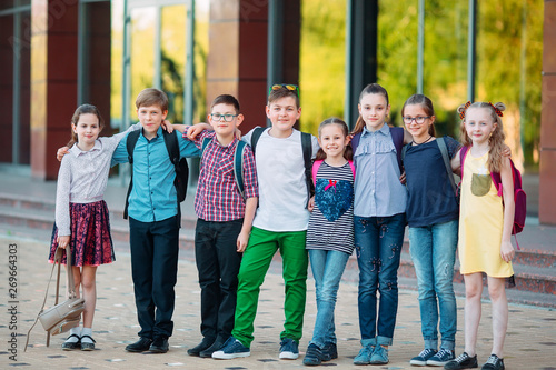 Children's friendship. Schoolmate students stand in an embrace on the schoolyard.