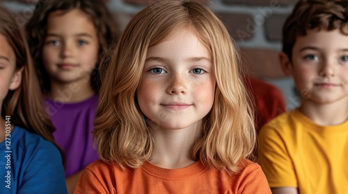 Children's group portrait indoor classroom candid photography bright colors close-up youthful diversity