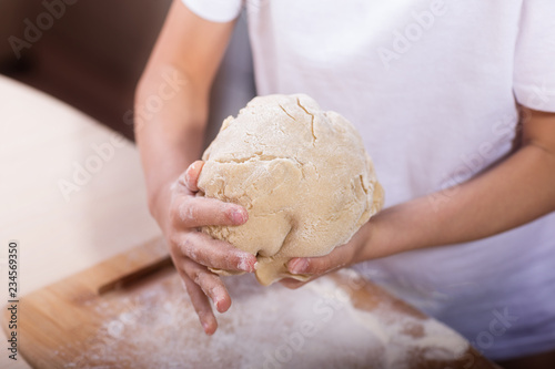 Children's hands knead the dough on a wooden cutting board. close-up. dough recipe, cooking technology