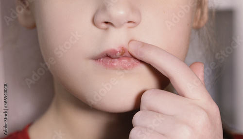 Children's herpes virus on the lip of a sick girl. The child points a finger at the wound on the upper lip. Close-up of the disease