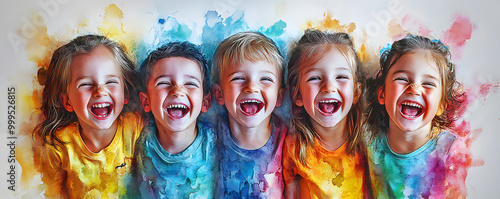 Children's Laughter in Watercolors: Artistic Portrait of Joyful Young Faces