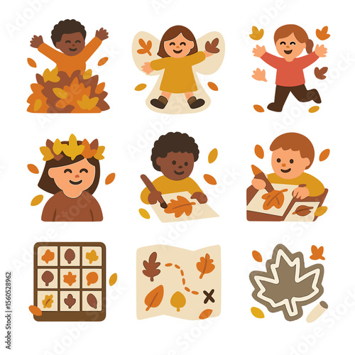 Children's Leaf Activities. Flat icon set of children’s fall fun: leaf pile jump, leaf angel, leaf toss, leaf crown, leaf painting
