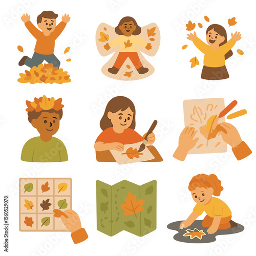 Children's Leaf Activities. Flat icon set of children’s fall fun: leaf pile jump, leaf angel, leaf toss, leaf crown, leaf painting