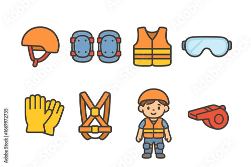 Children's Safety Gear Icons. Flat vector mini-illustrations safety gear in colors children's illustrations: helmet, knee pads,