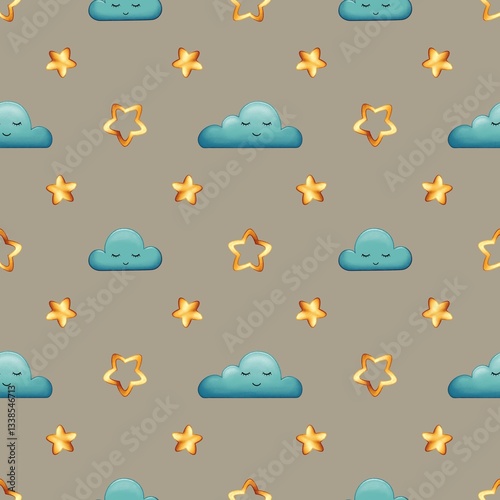 Children's seamless pattern: blue clouds and golden stars on a brown background. Ideal for clothing, textiles and wallpaper.
