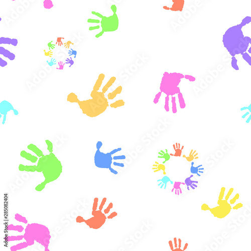 Children's seamless pattern of hand print on a white background. Vector illustration of a prints of palms. Children's hands, circle, kid handprint, baby palms, watercolor.