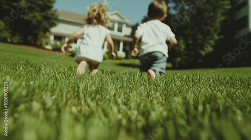 Children's siblings playing tag in the backyard.
