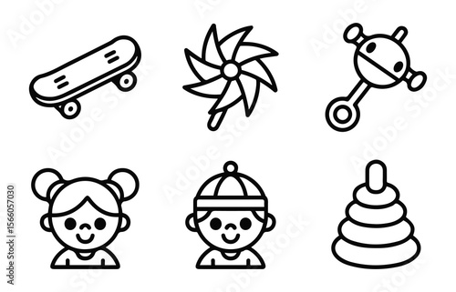 Children's Toys and Cute Kids Outline Icons Set.