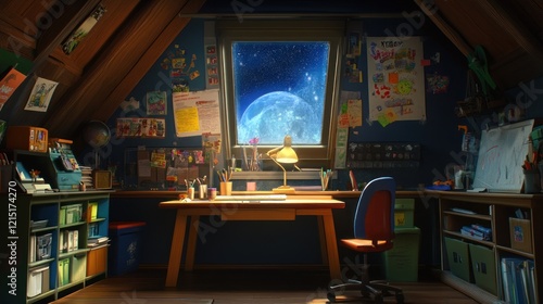 Child's attic room, desk, space view, homework, imagination, learning