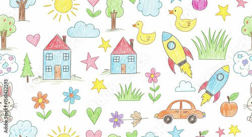 Child's Crayon Drawing Seamless Pattern: Playful Elements, Houses, Animals & Vehicles for Kids Design.