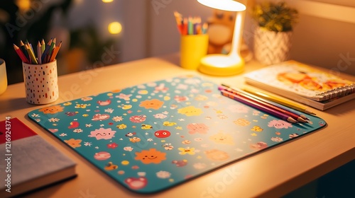 Child's desk with colorful pencils, notebooks, and a cute patterned mousepad.